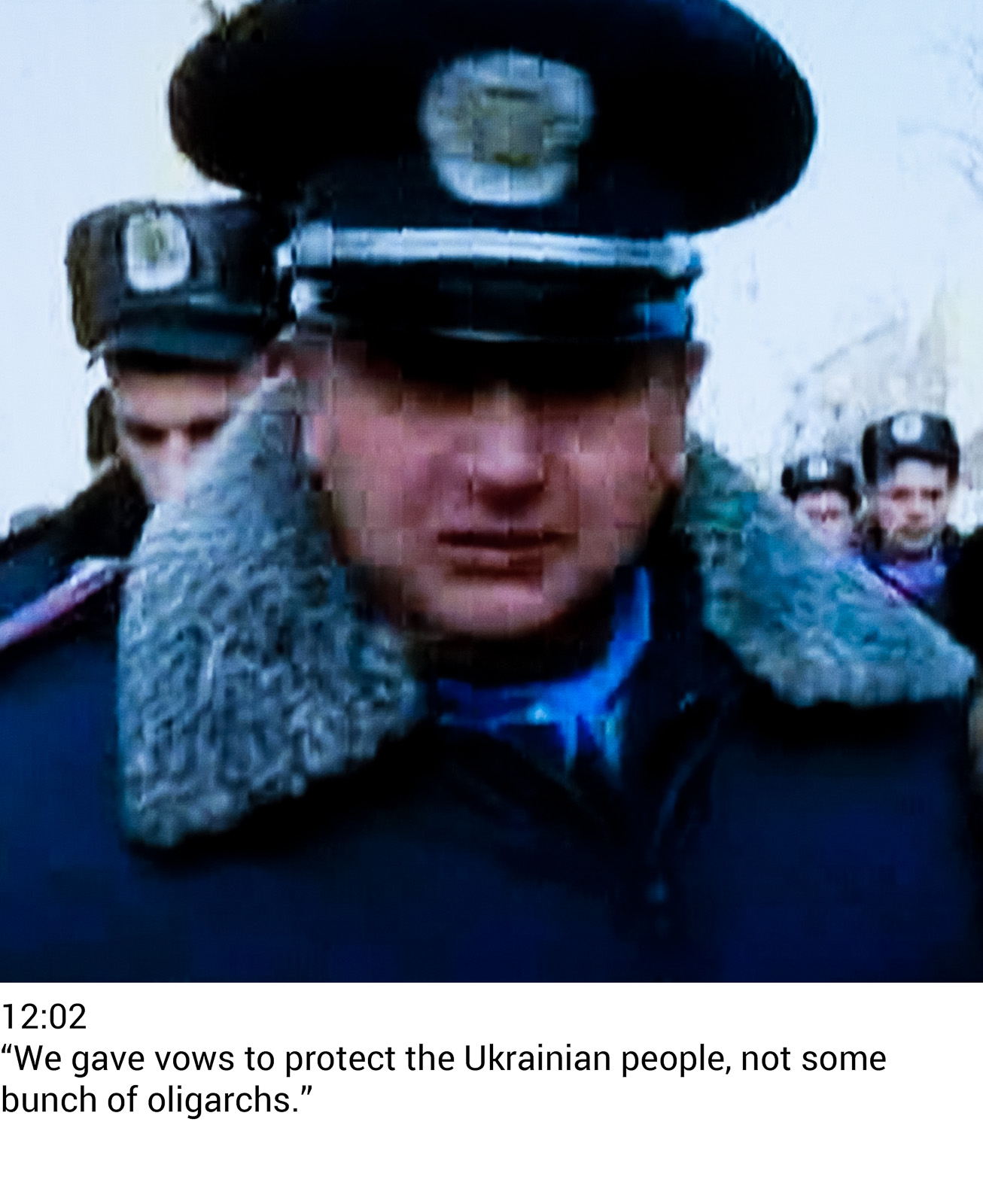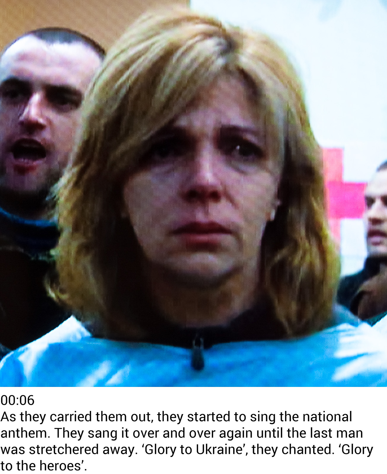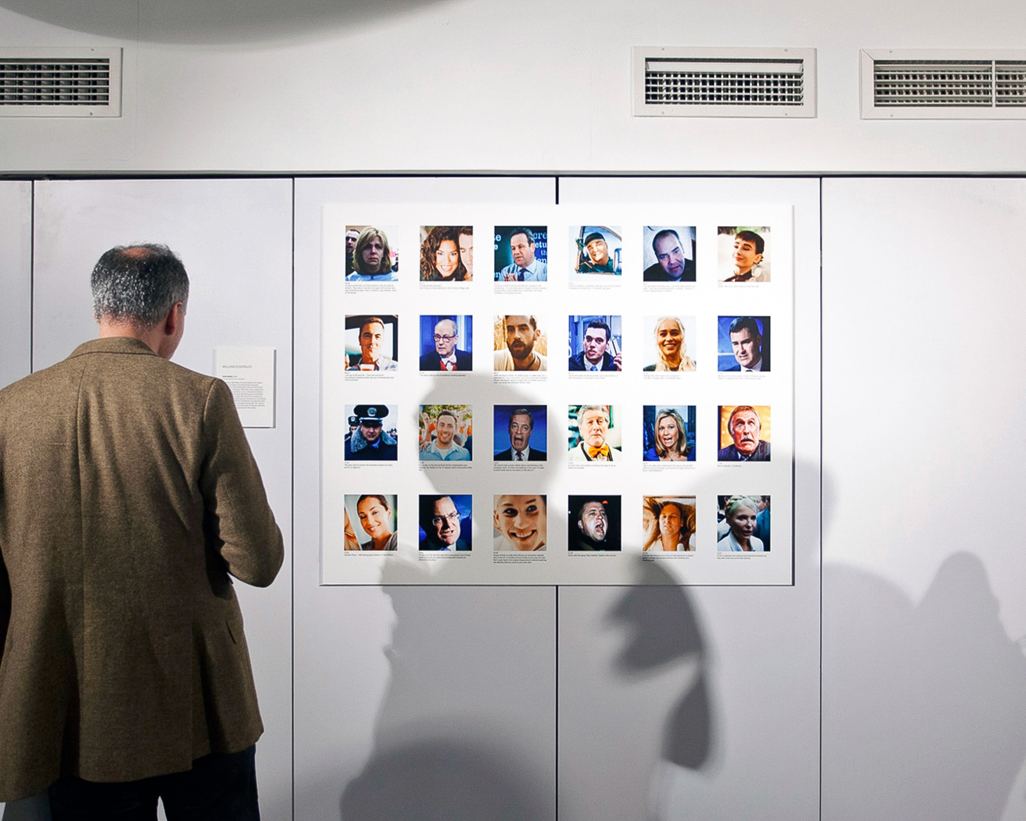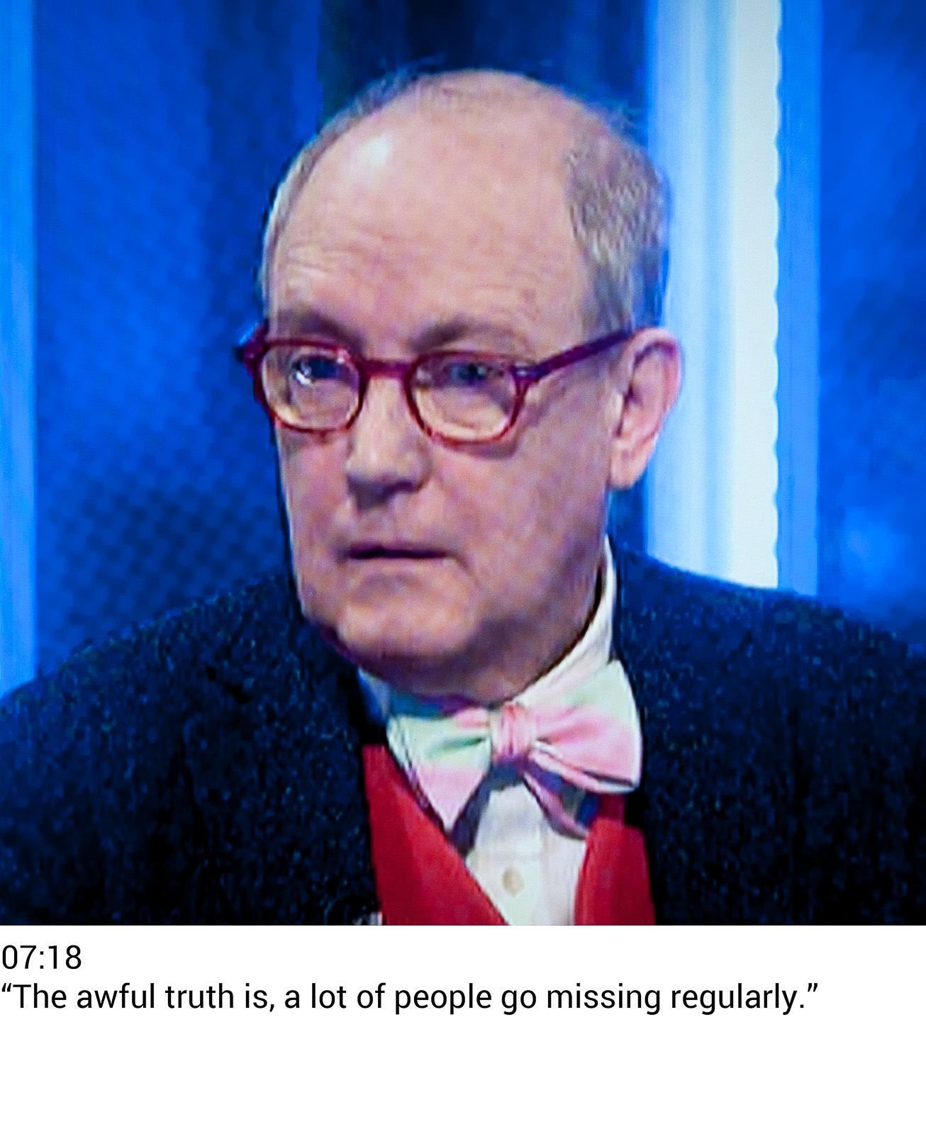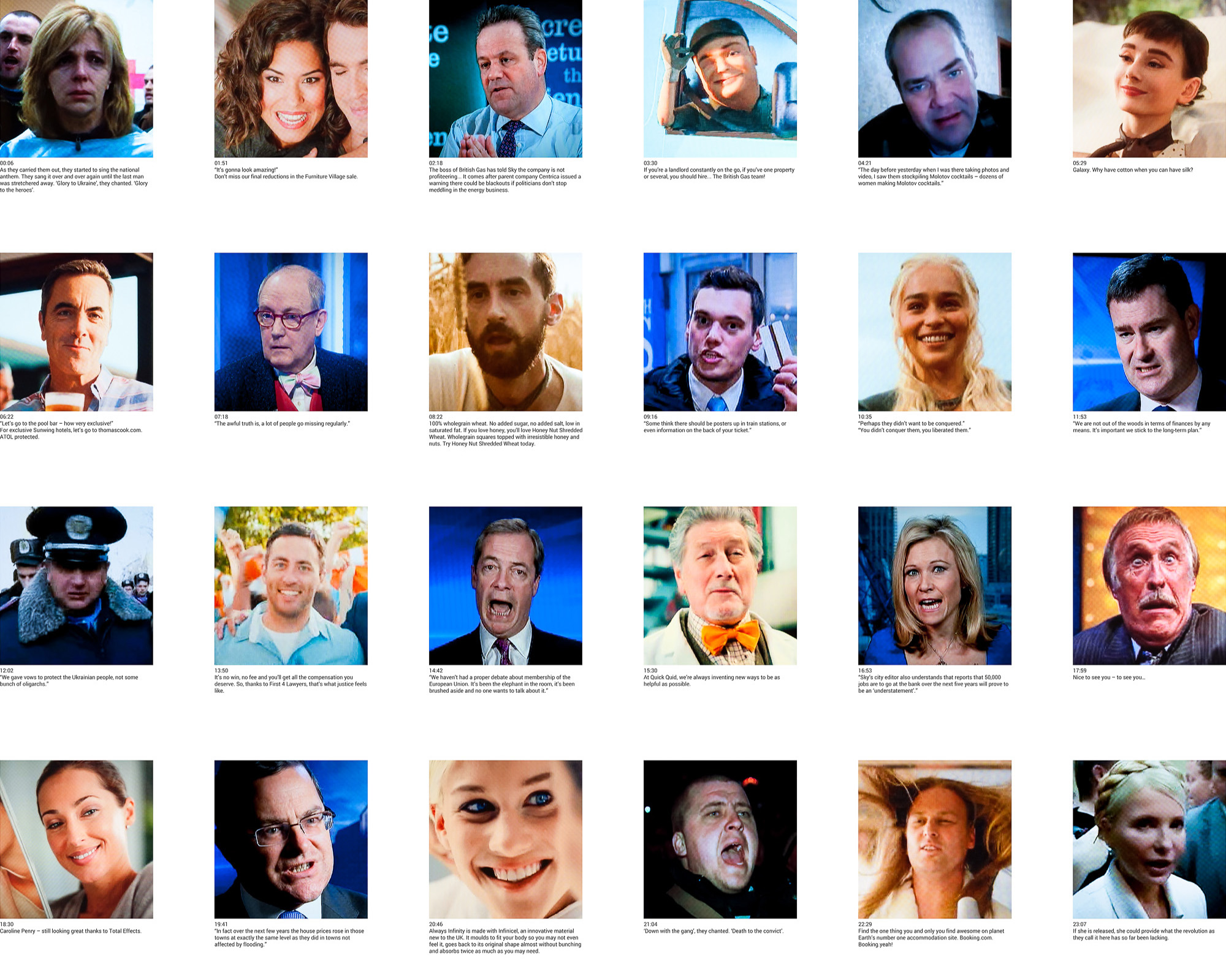 This work is a grid of captioned portraits from Sky News, taken during each hour of February 21st 2014, and alternating between news and advertising broadcasts. Whilst the journalism implies a position of omniscient gravity as a continuum of global tragedies is played out, the eternally sunlit uplands of marketing fantasy propose a very different view of reality…