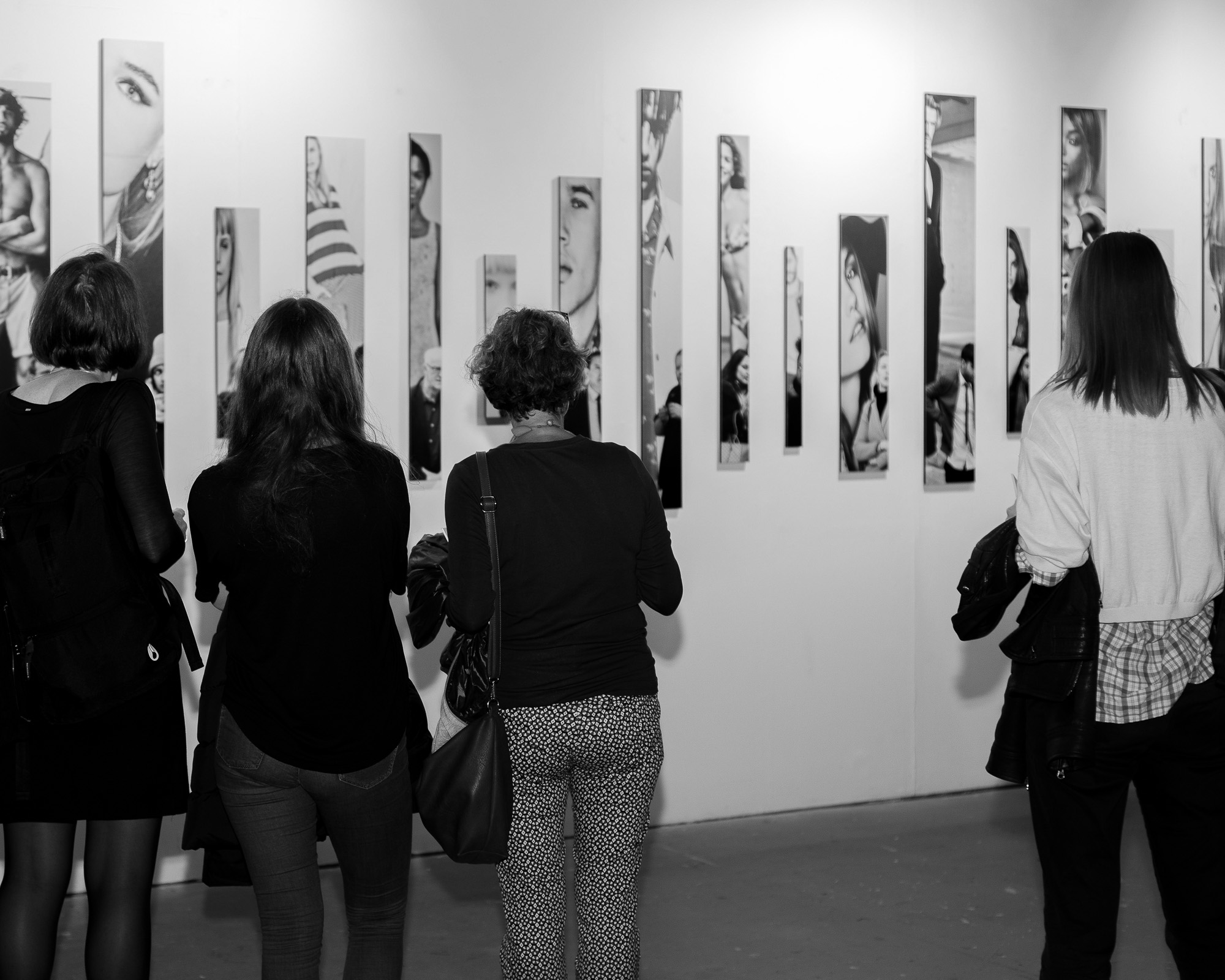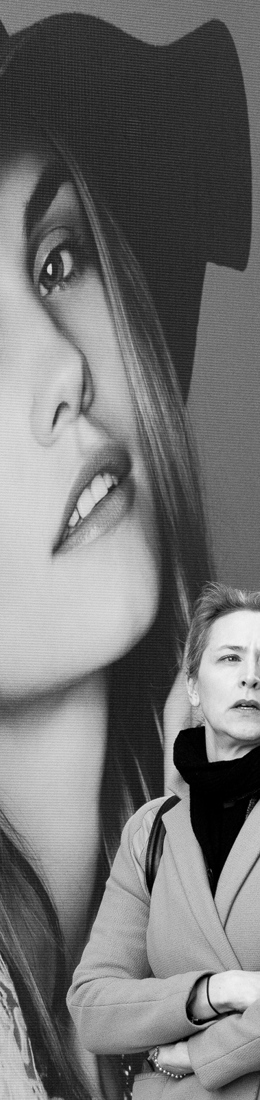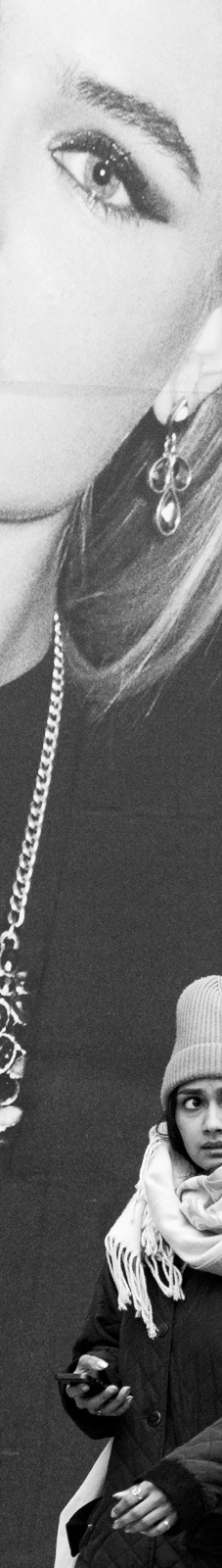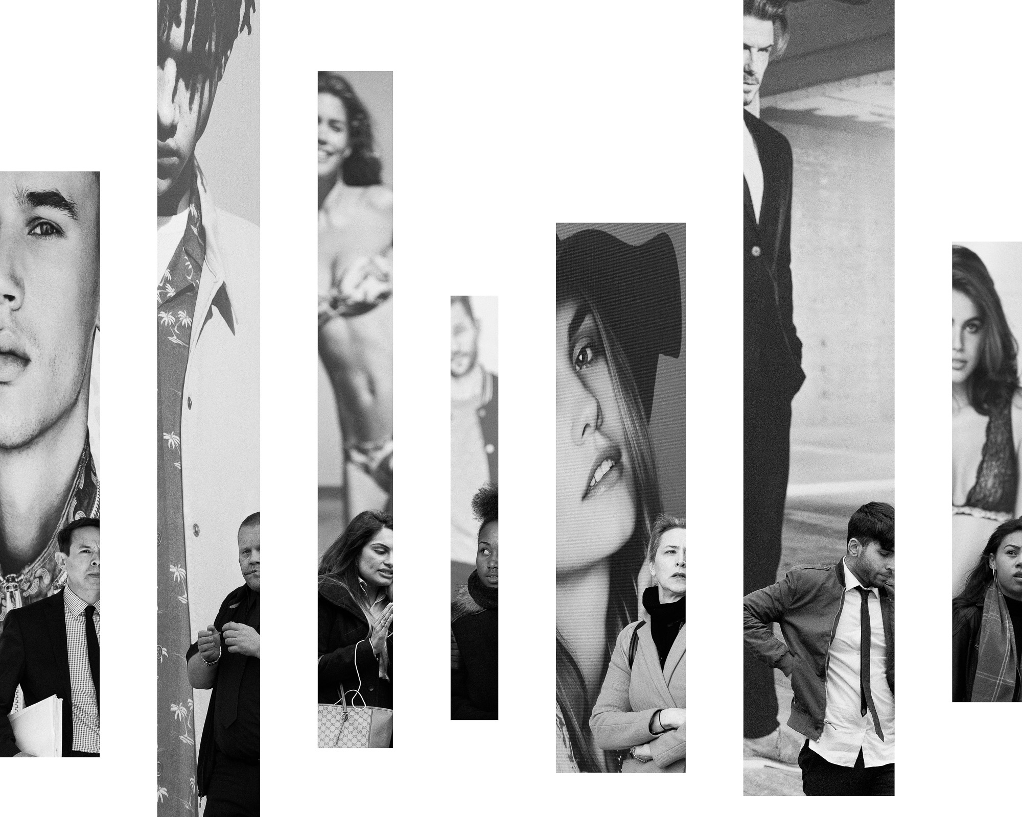 Oxford Circus is a typology of 24 dissected photographs, showing pedestrians around London’s famous shopping district, caught between the fixed gaze of my camera and the watchful eyes of advertisement models. The work investigates the rhetorics of both fashion and street photography – and hence a tension as old as the medium between the staged and the real, the picture and the document. With a pervasive culture of individualism and consumption as its subject matter, it also reflects on the politics of identity and alienation that such a culture engenders.